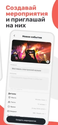 Создавай свои события и участвуй в событиях других пользователей - используй возможности встретить новых людей, которые разделяют твои интересы.