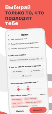 А если тебе не нравится начинать диалог с новыми людьми, то просто оставь информацию о себе и интересующие тебя мероприятия - спутники сами смогут найти тебя и пригласить на ивент.