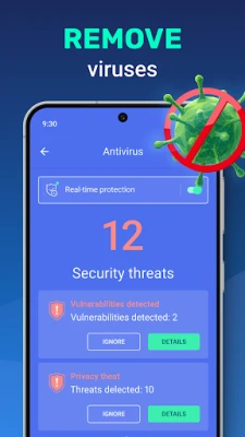Device protection against hacker attacks. The antivirus will scan, detect and delete viruses on your device. Device protection against all potential threats: viruses, trojans, malware, spyware, and adware.