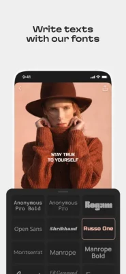 Add texts to your pictures. AppForType now has 60 fonts, half of them support cyrillic characters. You can also choose from 750 readymade texts and stickers for bloggers, travellers and lovers. We regularly add new goodies to our collection.