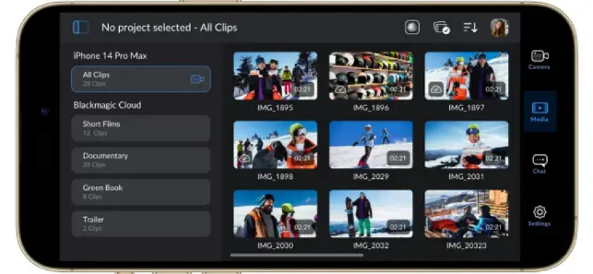 The Blackmagic Camera media tab has all the controls you need to browse or scrub clips for quick review, search and sort and view the upload status of your media. Access your media from Blackmagic Camera’s all clips folder by choosing the Media button to see the thumbnails for each clip you have stored. Plus, you can save to the files folder on the phone, send it to Blackmagic Cloud Storage via Blackmagic Cloud or manually choose which clips to upload to a project library. You can even sync media from Blackmagic Camera directly into the DaVinci Resolve project so you’re ready to edit!