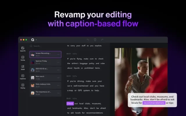 The editor is specifically designed for talking videos and makes it easy to edit the video by simply editing the words, removing filler words, and creating jump cuts with just one click. You can also add images and gifs that pop up as you talk. The captions are fully customizable with dozens of preset styles. The app also has a feature that uses AI to generate your video scripts using large language models like GPT-3 in seconds. And the dynamic island teleprompter feature makes recording videos very easy.