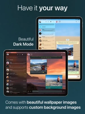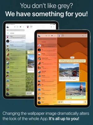 Messaging Apps by most people are used on a daily basis. We believe that something you use every day should be pleasing. Therefore we have designed the App with special emphasis on a beautiful design that looks stunning in Light or Dark Mode. But we also wanted to make using the App a very personal experience. Therefore the wallpaper image you choose gets reflected in many elements of the App. To get you started we provide a library of more than 20 stunning wallpaper images you can choose from. And of course you can also provide an image to use as wallpaper.
