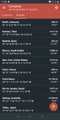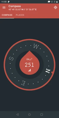 A magnetic compass with magnetic declination correction for best accuracy. A compass is an instrument used for navigation and orientation that shows direction relative to the geographic North. Geographic North is computed given the magnetic North and the magnetic declination at your current location. In some places around the world, the magnetic North can be as far as 20 degrees from the geographic North.