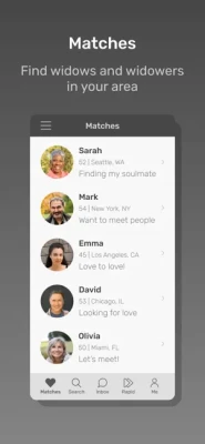 Download the Dating A Widower App and create a free profile right now and instantly connect with hundreds of widowed men and women that live in your area. It's about time for you to get back on the dating market! This Dating A Widower App will help you find love once again.