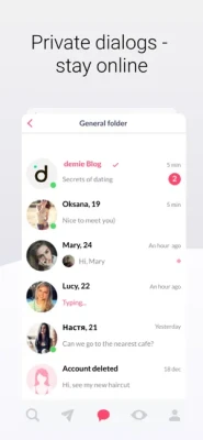 Demie – it's easy! Place an ad or just write to any person you like in the app: no more wasting time waiting. There are only a couple of hours between getting acquainted and going for coffee!
