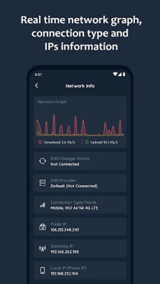 ✔ Gives Real time network graph, connection type and IPs information
