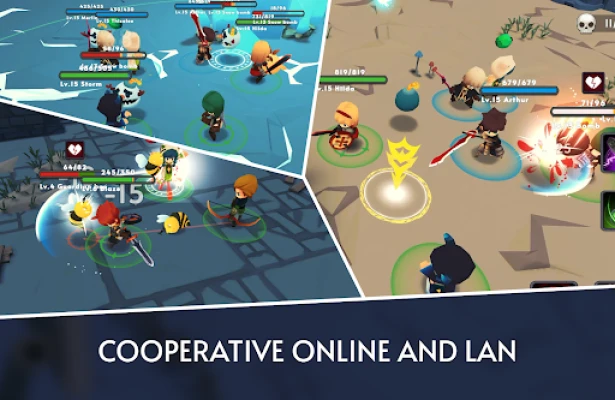 As the leader of a guild of heroes, you are in charge of their progress. Fight against monsters and epic bosses to collect equipment and new abilities, both alone and with friends. Enjoy online multiplayer battles against other players to raise your guild's ranking and gain access to more powerful weapons and accessories. You can also play offline, both single player and cooperative, and even participate in local multiplayer matches (LAN).