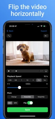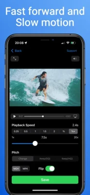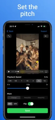 You can easily create slow motion videos and high speed videos.You can select the playback speed from a variety of speeds.You can even flip the video left and right for playback.You can also change the pitch of the sound to match the playback speed, or maintain the pitch.