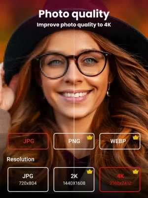 • It doesn’t even end here. You can save your images in up to 4K resolution! Our artificial intelligence can increase your picture’s resolution to its whole potential, with no detail loss and maximum quality.