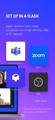 Perfect for business, online teaching, live streaming and more, EpocCam works seamlessly with popular video conferencing and broadcast software. Connect via USB or stream camera footage to your PC over Wi-Fi, and move freely while broadcasting anywhere in your local network.