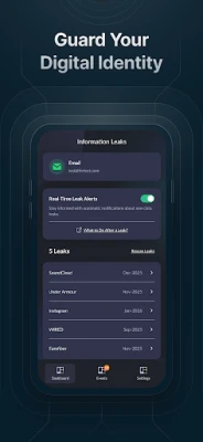- Scans for compromised data associated with the email address used to login in the app