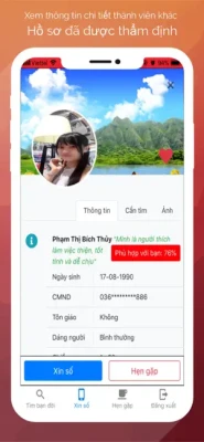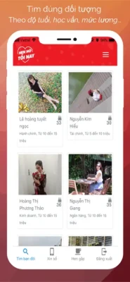 Hệ thống sẽ tự động tìm kiếm cho bạn đối tượng phù hợp đáp ứng những yêu cầu của bạn (độ tuổi, chiều cao, học vấn, mức lương,...)