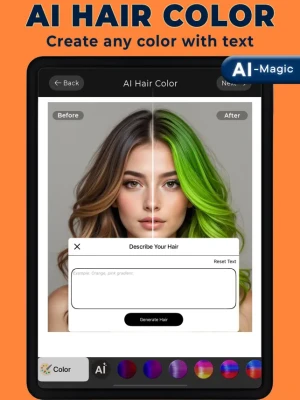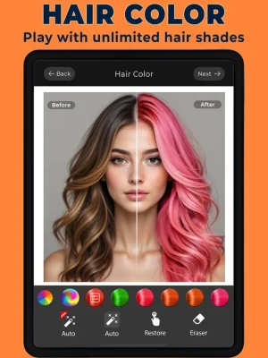 Transform Your Look Instantly with AI Hair Color Changer!Tired of the same hairstyle or curious how you’d look with bold new hair colors? Our AI-based virtual makeover tool makes it effortless to try on different hairstyles, swap hair colors, and enhance your natural beauty. With just a tap, you can experiment with endless looks—without ever visiting a salon.From subtle highlights to vibrant shades, sleek hairstyles to bold experiments, this all-in-one app gives you the freedom to discover your perfect style. Plus, enjoy advanced AI features like photo enhancement, eye beautification, and natural retouching.