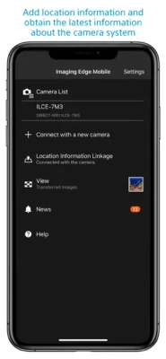 Imaging Edge Mobile allows images/videos to be transferred to a smartphone/tablet, enables remote shooting, and provides location information to images captured by a camera.