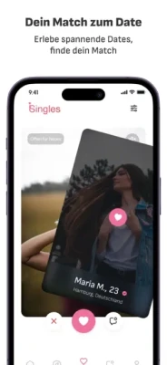 In the iSingles MatchGame, you see profiles of singles from your area. Swiping is super easy: if you like what you see, swipe right; otherwise, swipe left. If you have a match, you can start a conversation immediately. This feature is ideal for playfully getting to know singles and having fun at the same time!