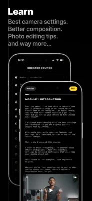 Linx Camera includes an exclusive Creator Course, offering a step-by-step guide to master your iPhone camera. The course includes video and text content to teach you the best settings and techniques to capture stunning photos.