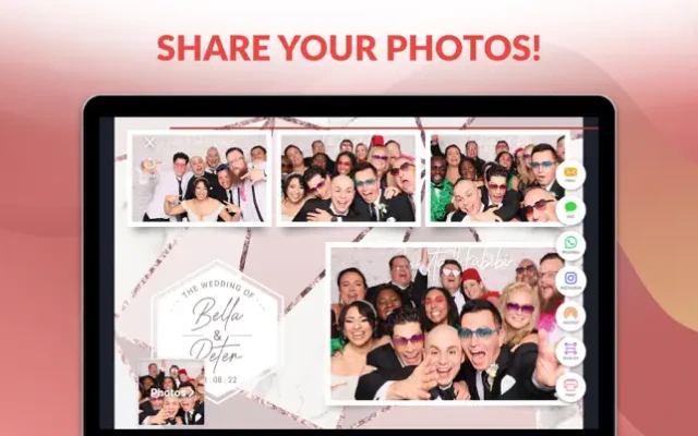 • Fully customize the start screen with beautiful built-in themes, and allow your guests to share using e-mail, SMS, Airdrop, QR code, WhatsApp, and Instagram whether online of offline.