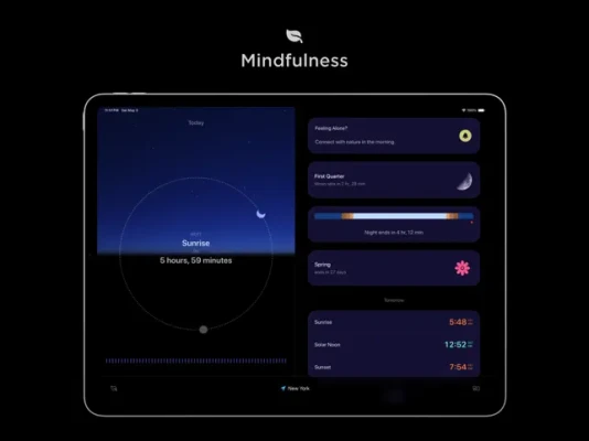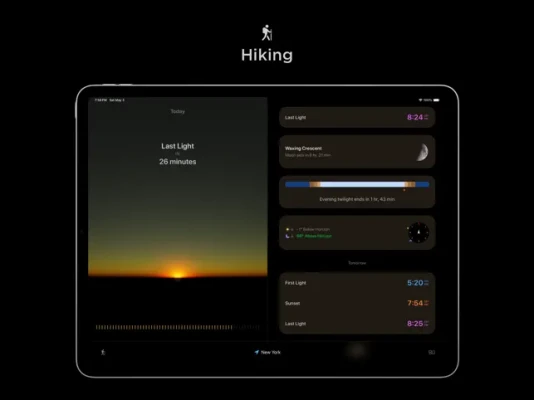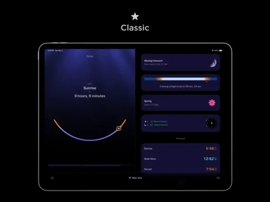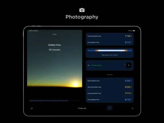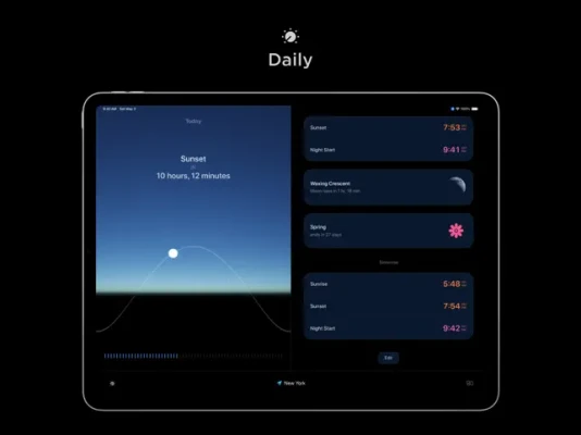 - Sun + Moon Tracking: Accurate data, solar compass, and future predictions.