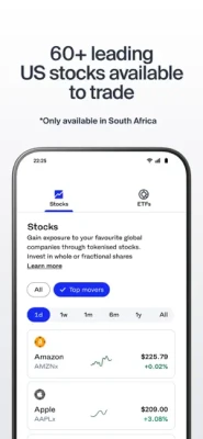 Buy and sell tokenised stocks: Invest in more than 60 tokenised equities with Luno, including Apple, Amazon, Meta, the S&P 500 and more. Invest outside of US trading hours, enjoy instant settlement on trades, and buy fractional shares from just R20. AVAILABLE IN SOUTH AFRICA. NOT AVAILABLE IN THE UK.