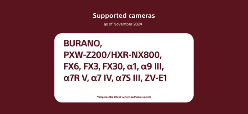 -Supported cameras (as of November 2024): BURANO, PXW-Z200/HXR-NX800, FX6, FX3, FX30, α1, α9 III, α7R V, α7 IV, α7S III, ZV-E1*Requires the latest system software update
