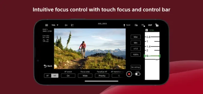 Various focus settings (such as AF sensitivity adjustment) and operations (such as touch focus) are available, with the control bar at the side of the screen allowing intuitive focusing
