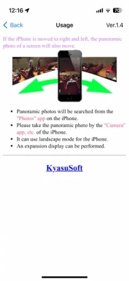 - Panoramic photos will be searched from the "Photos" app on the iPhone. - If the panoramic photograph is chosen, it will hold up facing iPhone and will move to right and left. - Please take the panoramic photo by the "Camera" app, etc. of the iPhone. - It can use landscape mode for the iPhone. - The photograph is indicated by expansion with 2 fingers.