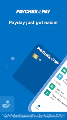 The Paychex Pay Deposit Account is established by Central Bank of Kansas City, Member FDIC. The Paychex Pay Debit Mastercard is issued