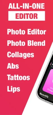 • There is only one photo from a bright event, but you do not like your appearance? The Beautify function will correct imperfections and add the desired bits of biscuit to your appearance. Photos from the beach are no longer a problem - add abs on the photo, without the gym.