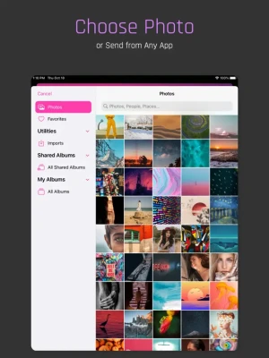 • Send any photo to the PhotoSplit app from the iPhone Photo Gallery and other apps directly through the Share widget.