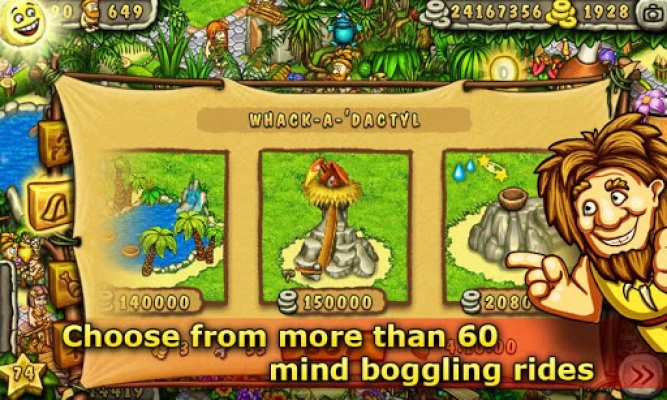 ★ You can choose from more than 60 mind boggling attractions and rides: giant wooden swings, trampolines made from mammoth hide, giddy merry-go-rounds, stone slides, extreme roller coasters, water rapids and even dinomotors powered by real huge Jurassic dinosaurs to make all these rides run!