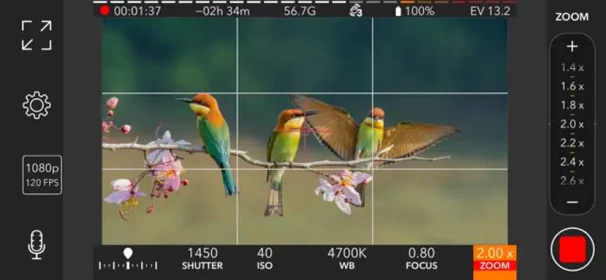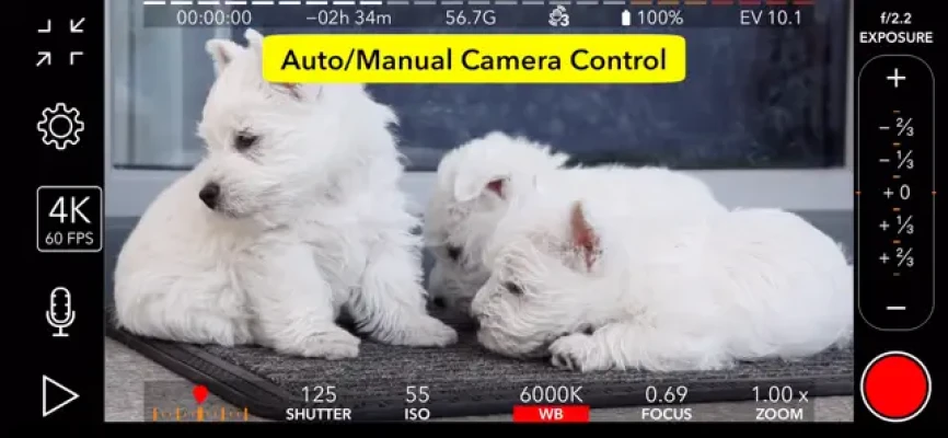 • Manual camera control for exposure, shutter speed, ISO, focus, and white balance.