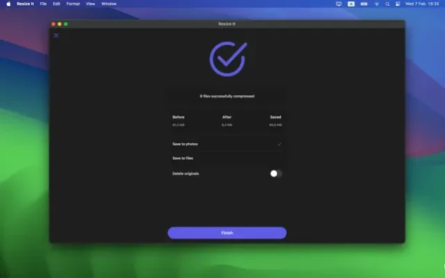 Compresses images one by one or several at once. You can minimize the size of just one picture, or an entire album to save storage. The algorithm of this application allows you to reduce image sizes and save up disk space without compromising the quality of the images. Download the app and test this modern way of handling data! You can delete the original photos or keep them in case you need them for something else.