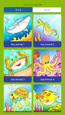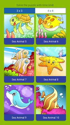 - 10 Funny Sea ANimal jigsaw Puzzle. - 2 Mode Play (Training and Chalenge By Time) - 9 and 16 pieces Puzzle - Play with your children and get fun
