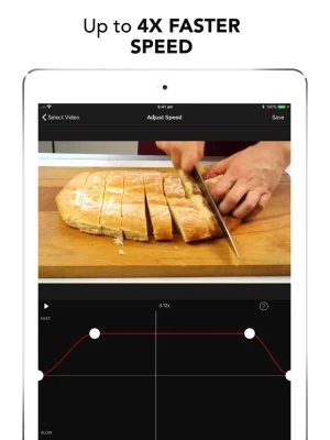 Speed up or slow down sections of video with FREE saving and NO WATERMARK! Supports portrait or landscape operation (on iPad), corrected audio pitch and unrestricted video length.