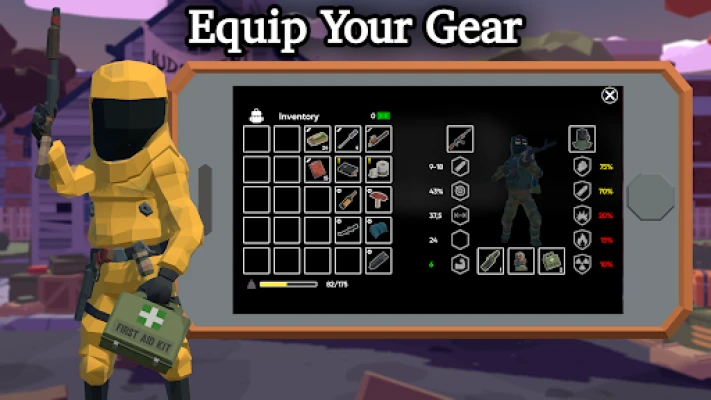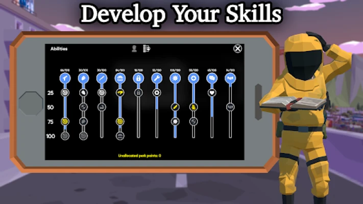 Your main goal is to escape from the post-apocalyptic city. To do this, you are provided with a system of characteristics and skills that you will develop as you level up.