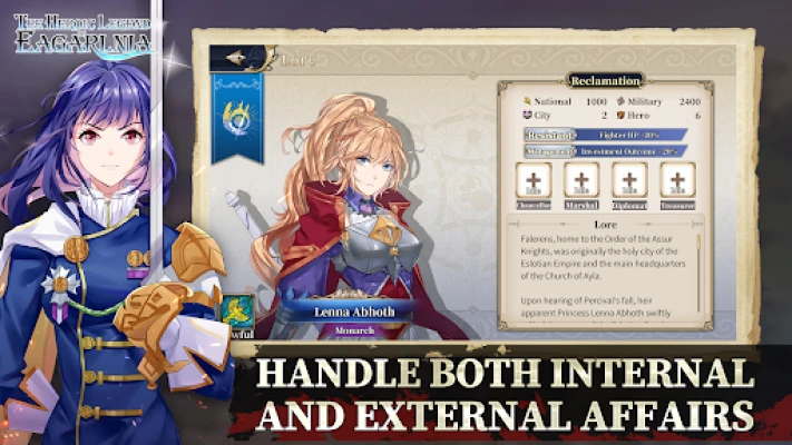 You will enter a world of Swords & Magic, where there are countries with different characteristics and potential relationships, and you can choose to become the monarch of any country. Through wise management of your own territory, you will grow your economic and military strengths, and eventually conquer other countries and become the overlord of Eagarlnia.