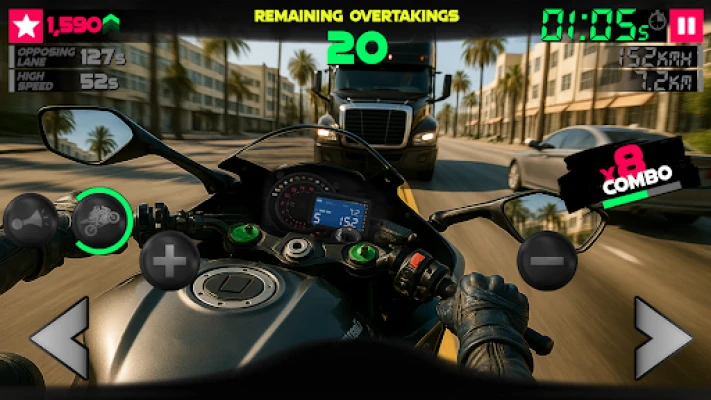 Enjoy the best motorbike driving graphics available on mobile today, in a casual, first-person game equipped with an advanced AI traffic simulator for total immersion.