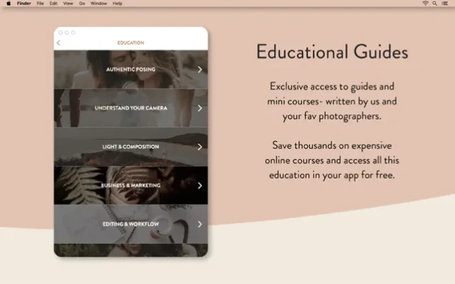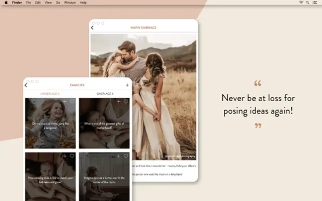 The Unscripted Posing App is filled with hundreds of emotive prompts & poses for every kind of photoshoot. Plus send clients digital invoices, contracts and questionnaires!