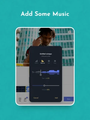 ‣ Select a mood (lo-fi, cinematic, upbeat, EDM) for a one-of-a-kind, royalty-free track — or use music from your library.