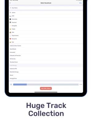 • Add music from your iPhone, from app’s track list or by recording. (Press on ‘+ Add Music’ Button)