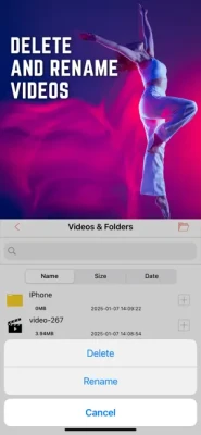 - Press plus(+) icon to Delete, Rename and Move videos.