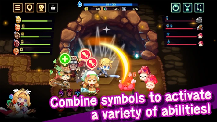Adding jewels to your party activates powerful symbol abilities. Mix and match the colors and symbols of the jewels you encounter to activate a variety of effects and build your own unique team!