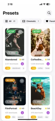 Stand out with our aesthetic filters: clean, moody, vintage, bright, cinematic, soft tones, retro, and many more. Our presets are crafted in collaboration with top photographers and influencers.
