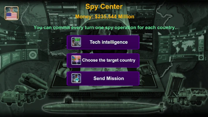 The game offers a wide range of features, including access to global Weapons Suppliers, a Spy Center, a War Room, Diplomats, the United Nations, an Economy system, Technology, and World News Distribution (Economy, Relations, Spy, and War). All this is powered by advanced Artificial Intelligence.